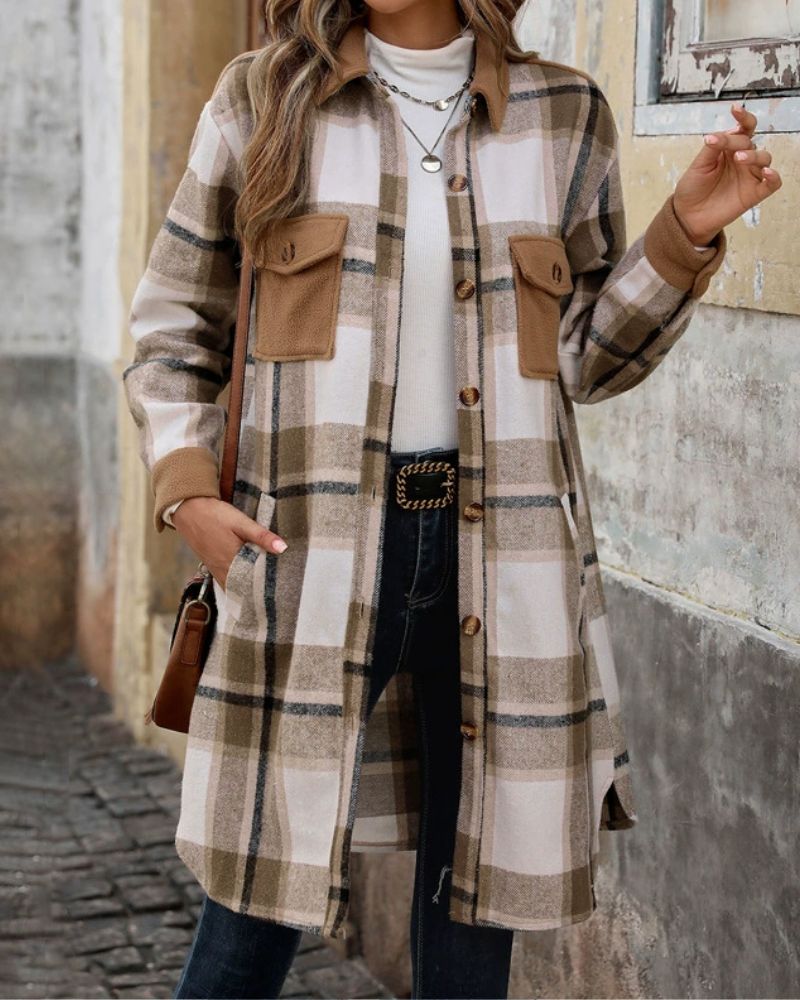 Women's Plus Size Long Flannel Plaid Shacket Jacket