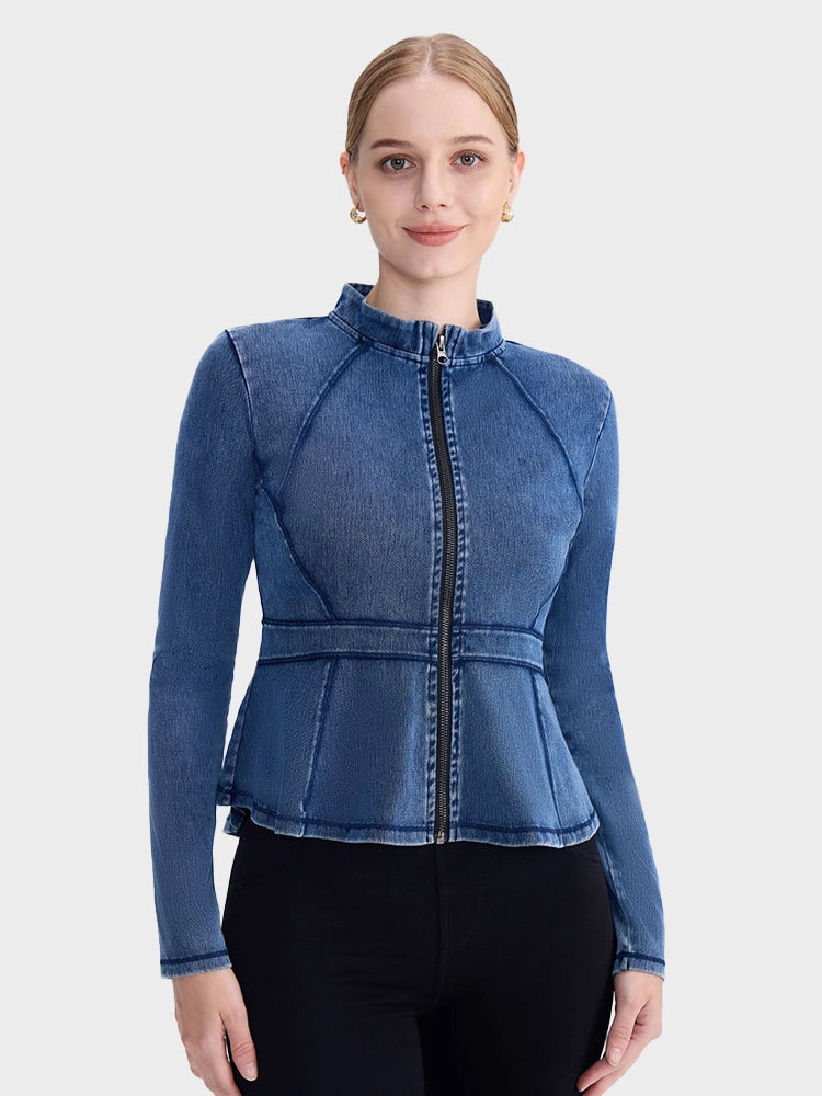 Slim Fit High-Neck Denim Zip-Up Yoga Jacket with Double Pockets
