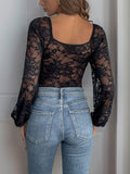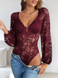 Women Deep V-Neck Embroidery Lace Bell Long Sleeves Bodysuit